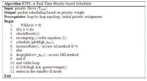 The RTPS algorithm describes the traffic scheduling mechanism for simultaneously occurring events in the supervised sensing area. The single queue is used for storing the packets. A threshold value is set to queue to prevent the packet loss in an overflow condition. The 2/3 packet level is the threshold value of the priority queue. The backpressure message is used to inform the packet level status in the queue. This approach helps well in advance to avoid unnecessary packet transmission and energy consumption. A data packet structure is restructured for different transfer flows in WSNs. For classification of data packets, additional filed are added into the basic data packet structure as shown in figure 2.