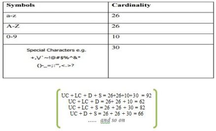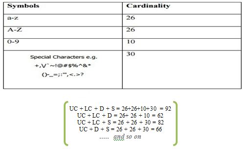 Numbers (0 to 9); that leaves us with 10 numbers. Characters (A-Z or a-z); 26 for upper-case letters and 26 for lower-case letters, so that the total is 52. Special Symbols (! @,., #, $, %, ˆ, & , and more) that are about 32.