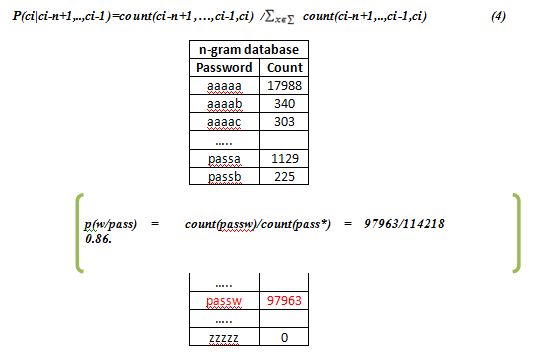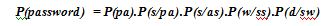 For instance: To compute the probability of the (password) with n = 5 is calculated as shown below: P(password) = P(p)P(a/p)P(s/pa). . . P(d/swor)