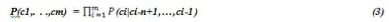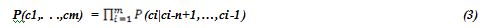 By using the n-gram used by Markov-model, the likelihood of the following character in a string based on a prefix of length n. Hence for a given string c1,…,cm we can write: [24]