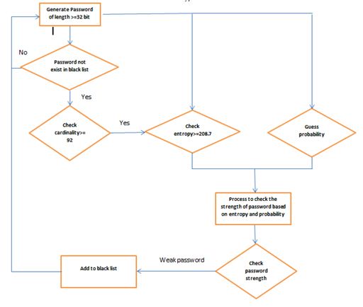 In our algorithm, we proposed a password with a length of 32 characters and an optimal password cardinality with a score of 92 and by applying the entropy equation we got a result 208.7, so that our conditions will be password length >=32, cardinality>=92, entropy >=208.7 and the “guess probability” (GP) should be over a specific threshold. The resulting score indicates the strength of generated passwords, if it is classified as weak passwords we put it in a black list to be ignored next time before check and we regenerate another password, while if it is classified as strong password we accept it.