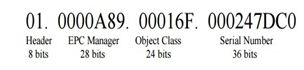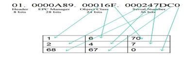 4.Electronic Product Code (EPC): A unique code for objects stored in RFID tags memory, matching the same functionality of barcode numbering scheme (UPC). This code is a 96-bit number as in Figure 2.