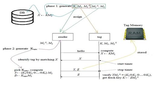 The algorithm assumes that each tag and reader stores a square matrix, and each of them stores one matrix and the inverse of the matrix which exist in the other end of the same size. The tag and the reader share the key K. With the knowledge that the selected key and matrices are generated randomly by both the tag and the reader. [5][6]