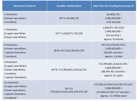 The feasibility of brute force relies on the domain of input characters of the password and the length of the password. Table 4 shows the number of possible passwords for a given password length and character set, as well as how long it would take to crack passwords of that type.[12]