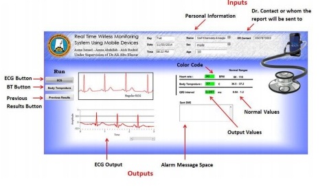 The program flowchart (see Figure 5) shows the steps of the program for the system. The program starts by receiving the readings from the sensors connected to the patient’s body through wires. The acquired data is then sent to the programming environment (i.e., LabVIEW Software). The program analyzes and displays the data regarding the body temperature, ECG and heart rate. Finally, the data are saved and are also used to generate well-organized report by the system with respect to the time. The complete flowchart can be found in Appendix A of this paper. The front panel of the system is shown in Figure 6. It presents data regarding current day, date and time, ECG signal, QRS interval, heart Rate, blood pressure, and body temperature. A button located in the front panel can assist in retrieving previous data. This button is also linked to Microsoft word program to tabulate the previous results in an organized report that enables doctors and caregivers to follow patient’s health status for the previous periods.