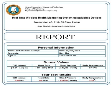 A sample report of a patient is shown in Figure 7. In addition to some personal information of the patient and timing data the report presents the monitored physiological data. It is depicted in the report that the heart of the patient is in normal condition. The other data including blood pressure and body temperature are also in the normal range. In order to check the reliability and validity of our system accuracy, we went to one of the local hospitals and we compared the performance of our system with that of the existing system of the hospital. We conducted test experiment on one of the patients with heart disease there. The ECG signal generated by the hospital’s existing system is shown in Figure 8 and the same generated by our
