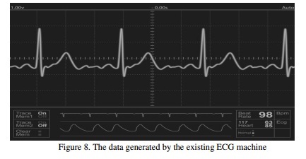 system in shown in Figure 9. We recognized that we obtained the same results of ECG signal and heart rate (i.e., 98 beats per minutes) from both systems. But, we discover some noise associated with the ECG signal generated by our system. This noise was generated by the electronic components used in our system as well as other existing electronic and electrical components in the hospital