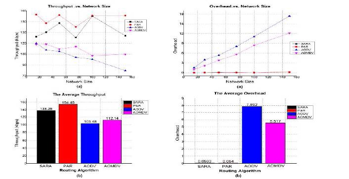 The results of simulation are tabulates and depicted in the Table 2, Table 3, Table 4 and Table 5 in annexure. In each sets of graphs, the performance of proposed work and other algorithms such as SARA, AODV and AOMDV with respect to number of nodes is shown line graph (a) and the average performance of all routing algorithms is shown in bar chart (b).