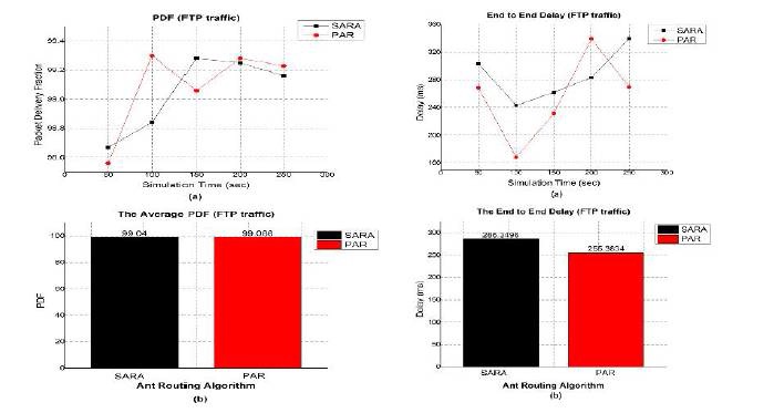 The graphs in Figure 9(a), (b) shows the performance of four routing algorithms in terms of end to end delay. The end to end delay of PAR is less SARA but higher than AODV and AOMDV. From the graph of Figure 9(b), the average end to end delay is 6.825 % less than SARA, 36.22 % more than AODV and 16.568 % more than AOMDV. The graphs in Figure 10(a), (b) shows the performance of four routing algorithms in terms of throughput. The proposed PAR provides the better throughput when compares with SARA, AODV and AOMDV. From the graph of figure 10(b), the average throughput 11.7179 % more than SARA, 49.32 % more than AODV and 37.729 % more than AOMDV.