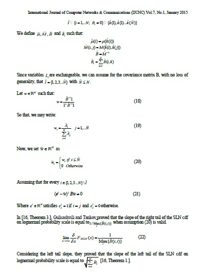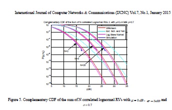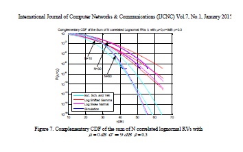 International Journal of Computer Networks & Communications (IJCNC) Vol.7, No.1, January 2015150In this paper, we proposed to use the Log Skew Normal distribution in order to approximate the sum of correlated lognormal RVdistribution. Our fitting method uses moment and tails slope matching technique to derive LSN distribution parameters. LSN provides identical results to Monte Carlo simulations results and then outperforms other methods for all cases. Using an example for outage probability calculation in lognormal shadowing environment, we proved that LSN approximation, considered in this work, is efficient for interference calculation process.
