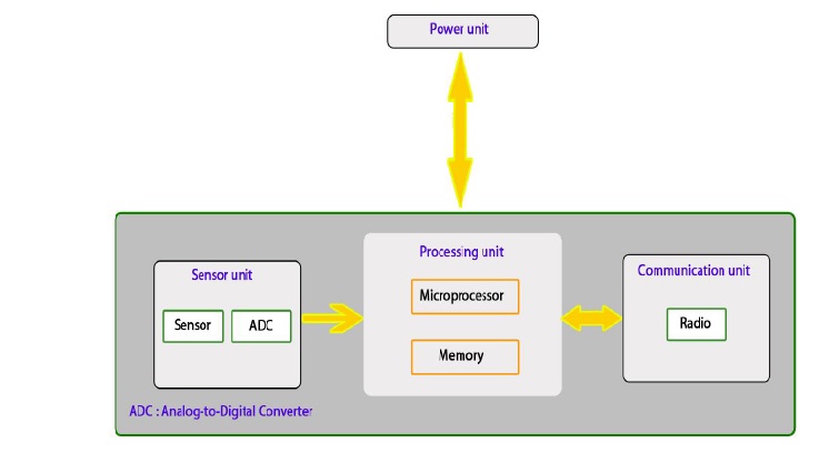 Several sensor models are offered according to the underlying application. In general, a sensor node has: a sensor unit whose role is to capture a physical quantity and transform into a digital value; a data processing and storage unit; a wireless transmission module; a unit of management and control of energy. Also, depending on the application, some modules are added: GPS, solar cell, etc. Figure 2 present general node architecture.