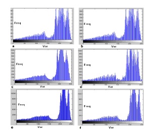Figure 8: Histograms of different layers of the cover image and the corresponding stg image. (a) And (b)for red channel. (c) And (d) for the green channel. (e) And (f) for the blue channel.