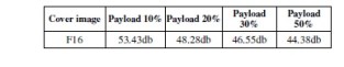 In addition, the histograms in Figure 8 show that the matching between cover and stego images has been satisfied at the red channel while the noise are appeared at stego image in the blue channel. Table 2 shows the PSNR values for different payload percentages on the F16 as the cover image. It appears that the percentage of the payload (amount of bits to be hidden) have highest PSNR at the payload percentage equal to 10%. In addition, the results appear that PSNR value is decreased when the payload percentage has been increased, where the percentage of PSNR has been reduced about 9.63% for the payload percentage equal to 20% and has been reduced about 12.87% for the payload percentage equal to 30% and has been reduced about 16.93% for the payload percentage equal to 50%.