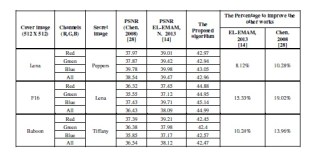 In Table 3, a comparative study with other researchers has been taken up with the same circumstances (same cover images, same secret images, and same image size). These comparisons are applied between the proposed approach and the two previous according to the value of PSNR. The results confirm obviously that the proposed method is more secure and preserved secret information than the other steganographic schemes. It appears that the average of three stego images in the proposed approach is better than (EL-EMAM, N. 2013) [14] and (Chang, C., 2008) [28] about 11.23% and 14.42% respectively