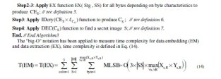 Definition 4: The embedding function (EM) is represented in the mapEM:C SS CE Stg S × × ® and it bases on byte characteristic assessment in a cover image C (tocompute a number of bits to be hiding NBTH) , set of segments SS, and a secret image’scompression and encryption S CE ; see section 3.