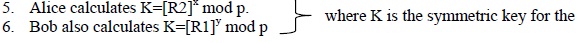 1. Alice chooses a large random number, x, such that 0=< x <=p-1, and calculates R1= gx mod p.
