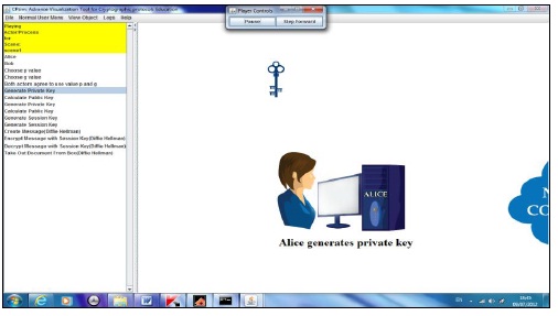 In order to visualize the Diffie-Hellman protocol using CPAnim tool, the user has to first select the two actors (Alice and Bob) designated to run the key agreement protocol. Each actor has a unique color code (Alice is blue and Bob is brown). Then, the user constructs the scenes by choosing the processes that are related to the Diffie-Hellman protocol under the process options. Any generated key has the same color as the creator of this key. For example: Alice’s private and public keys are blue. Finally, an actor can swap his/her own public keys with those of the other actor, or get a copy of the public key which belongs to any other actor and combines it with his/her own private key. The combination of the two keys will result in the generation of a new secret key (black key). Once generated, the new symmetric key can be used by the actor to encrypt a message and send it to another actor.