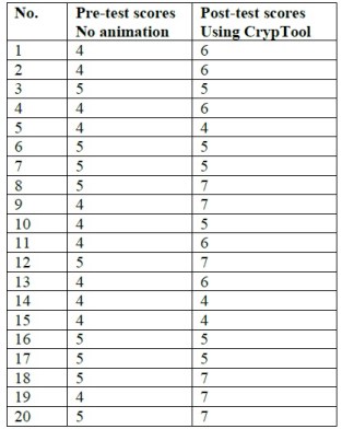 A total of 20 students participated in the experiment. The students are final year of Computer Science students (undergraduate students) at Sebha University of Libya. We follow the pre-test to post-test accuracy [8,27,30] in order to evaluate the effectiveness of CrypTool. The same students were given the same lesson but using different medium each time. The experiment was conducted using the learning medium approach (no animation vs. animation with CrypTool). The students were given the lesson using only text-based materials followed by a pre-test, then, the same students were introduced to CrypTool followed by a post-test.