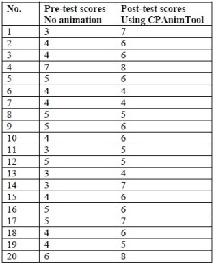To determine the effectiveness of CPAnim Tool, a pre-test and post-test accuracy is used. Table 4 describes the students’ scores for the pre-test and post-tests. Notice that the maximum score for each student is 10. In the other side, the Table 5 describes the mean of the group tested and Figure 7 explains the idea.