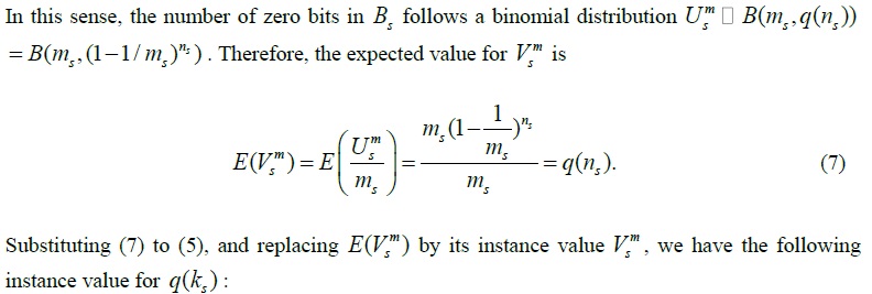 Because the bits in any logical bit array are randomly selected from the bitmap Bs , each of the ns SYN packets has about the same probability of 1/ ms to choose any bit in Bs . So for an arbitrary bit in Bs , the probability for it to be ‘0’ after storing all ns distinct SYN packets is