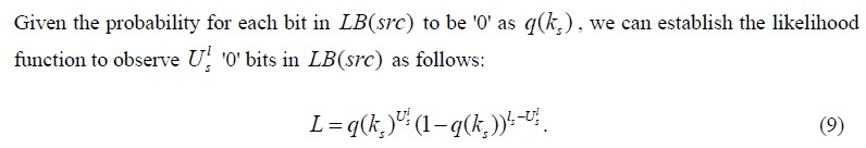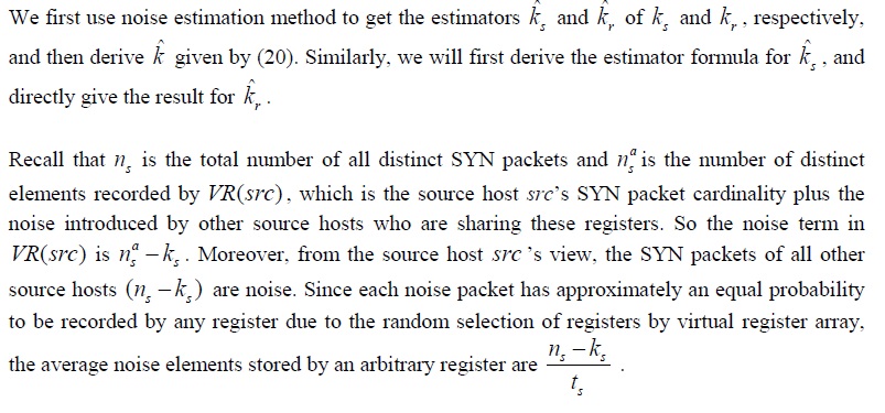 Note that ks is the actual rate of distinct SYN packets sent by a source host src , and ns is the rate of distinct SYN packets sent by all hosts within the router’s network. Consider an arbitrary bit b in LB(src) . A SYN packet sent by src has a probability of 1/ ls to set b to ‘1’, and a SYN packet sent by any other host has a probability of 1/ ms to set b to ‘1’. Hence, the probability q(ks) for bit b to remain ‘0’ at the end of the measurement period is