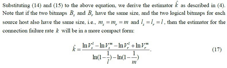 However, for rate limit to work properly, we must be able to measure the connection failure rates of individual hosts accurately and efficiently. This paper points out that using Internet Control Message Protocol (ICMP) messages for this purpose [21] is flawed as they are widely blocked on today’s Internet, and the total number of message packets in this big data [22] [23] [30] [31] and cloud computing [36 – 39] era is enormous. In this paper, we first design a novel measurement method that solves the problem with a highly efficient data structure based on bitmaps [41], which keeps record of connection attempts and results (success or fail) in bits, from which we can recover the connection failure rates, while removing the duplicate connection failures (which may cause bias against normal hosts). Our double-bitmap solution is highly efficient for online per-packet operations, and the simulation results show that not only does the data structure place a small memory footprint on the routers, but also it provides good measurement of connection failure rates whose accuracy can be tuned by system parameters. However, we discover the double-bitmap solution has a limitation: it is difficult to extend the estimation range in such memory constrain without causing estimation inaccuracy. In order to address this problem, we propose another solution based on shared register array data structure [42], achieving better memory efficiency and much larger estimation range than our double-bitmap solution.