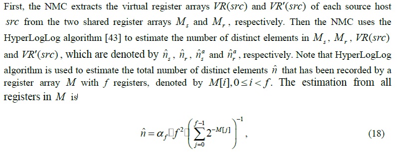 At the end of each measurement period, the edge router will send the two register arrays Ms and Mr to the NMC, which will estimate connection failure rate k for each source host src based on Ms and Mr , and notify the edge router to apply rate limit algorithms if needed. The measurement process is described in the following.