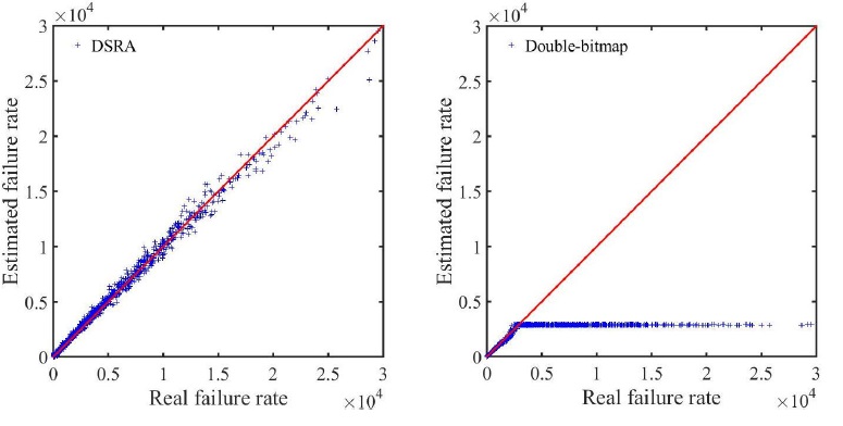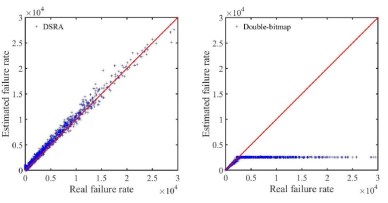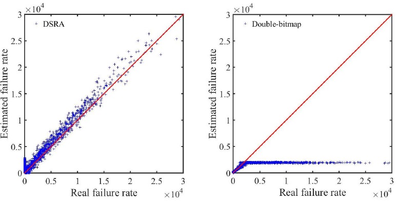 From the three figures, we can observe that the points in our DSRA scheme are clustered around the equality line. Therefore, the measurement result for the connection failure rates of our DSRA scheme is accurate under all three different memory constraints. As the memory size decreases, Figure. 4-6 show that the measurement result to be slightly deteriorating accuracy. However, the double-bitmap scheme is no more accurate when the actual connection failure rates are larger than around 2,500, which means its estimation upper bound is limited. One can observe that there is a tendency for the measurement upper bound for double-bitmap solution to be larger with a bigger memory size. Furthermore, for our DSRA scheme, small memory of size (equivalent to 2.5 bits per source host on average) is adequate enough to get sound measurement results as shown in Figure. 6. And the upper bound of DSRA scheme is 232 which is appropriate in many real applications. Clearly, through above analyses, our DSRA scheme outperforms the double-bitmap scheme, because it can work well with a much more strict memory constraint and much larger estimation upper bound.
