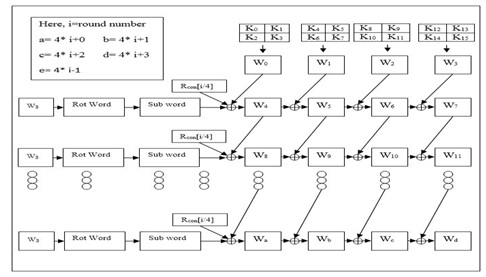 In cryptography , each round consist of same set of operations but some parameter like cipher key or round key are different from each other. A Key Schedule is an algorithm that gives those round keys for each round [4]. Suppose, each word length wi= 32 bits = 4 bytes. So a key consists of 4 words (4*32=128) and the initial round key is w0 + w1+ w2+ w3.