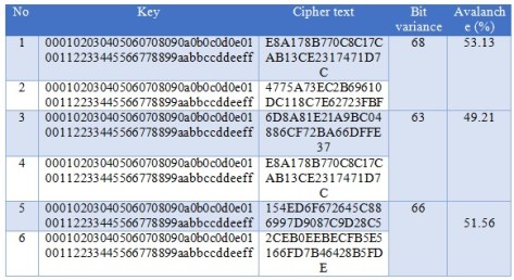 Table 12. Avalanche Effect for Fixed 128 Bit Key and Variable Input Block