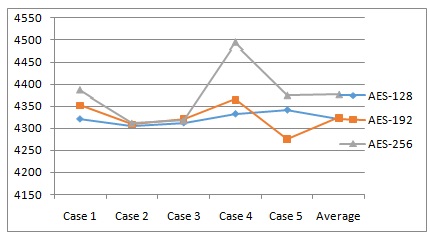 Table 14 shows that, in five experiments for 8112 sample encryption, average 4347 times the proposed AES-128 maintains the SAC condition. That means for single bit variance in input plaintext, bit variance in chipper text is more than 50% for average 4347 times.
