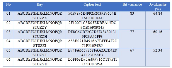 To compare Avalanche effect criteria between existing & proposed plan, we did three experiments for proposed plan and a single experiment for existing system. In every experiment 8112 sample inputs were taken. For every input, we computed the avalanche effect and took the average of all 8112 inputs. The total result is enlisted in table 22.