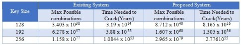 For existing AES-256 brute force attack checks maximum 1.158 x 1077 key combinations to find the key and it needs almost 5.88 x 10 33 years to crack AES-256 with the fastest Super Computer of this age. In our proposed AES-256, the plaintext block size is 128, key size is 256 and additional random key size is 8. For this additional 8 bits, brute force attack has to check maximum 1.158+E77 x 28 (2.965 x 1079) key combinations to find the key and it needs maximum 1.0844+E53 x 28 (2.776 x 1055) years to crack the proposed AES-256Error! Reference source not found.Error! Reference source not found. with the fastest Super Computer of this age. So, it is not possible for human being to check all the key combinations.