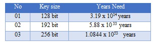 As shown in table 2, even with a supercomputer, it would take 1 billion billion years to crack the 128-bit AES key using brute force attack.