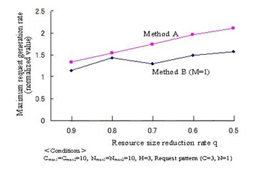 rate of request which ensures that the average request loss probability is less than 5%. It is supposed that L is given by H/q for both Methods A and B (L becomes large as the value of q becomes small (namely, as the size of resource allocated is reduced)). The maximum generation rate of request will increase as the value of q becomes small, even for Method A. Figure 7 shows resource utilization of Methods A and B under the same conditions as in Figure 6. Figure 8 shows how the maximum request generation rate is affected by the ratio of the number of requests with M=1 to the number of requests with M=q, α, in Method B. As in Figure 6, Figure 8 supposes that the average request loss probability isless than 5%.