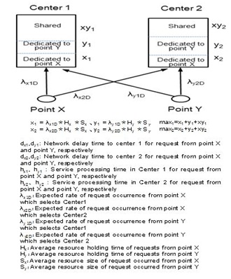 Figure 1 illustrates the system model for cloud computing environments. Figure 2 illustrates the resource allocation model based on the system model in Figure 1. These are the same as the models described in References [17]-[20]. There are k different resource sets, and each resource set in each center has some processing ability and bandwidth. When a request is generated, the optimal resource set is selected from among k resource sets, and processing ability and bandwidth is allocated simultaneously from the same selected set. It is not allowed to allocate processing ability from one resource set and bandwidth from another resource set.