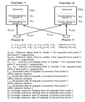 The evaluation is performed by a computer simulation. The simulation model is based on Figure 2 with k=2. That is, there are two resource sets. Servers at each center, a network for connecting to the servers, user access points, and user requests are virtually realized on a UNIX-based computer. The simulation program using C language was created by ourselves, not the existing products.