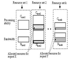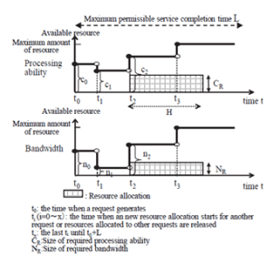 If the required multiple types of resources are not available to meet the service request, the request is handled as follows. The system estimates the time when the requests will be completed and sufficient sizes of all types of resource will become available with the resource management chart as illustrated in Figure 5. In this figure, t0 means the time when a request is generated, at t1, new resource allocation starts for another request, and at t2 and t3, resources allocated to other requests are released. At the time of t=t0 or t=t1, bandwidth is not available although processing ability is available for the duration of resource allocation. As both types of resource are available at t2, the time of t=t2 is chosen as the appropriate start time of resource allocation. It then tentatively allocates resources to the request from the time of t=t2 so that they will become available to the request. When the time comes for the tentative allocation is to take effect, the resources are actually allocated.
