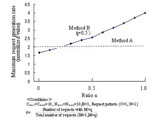 2) As the ratio of the number of requests which do not require a long extension of the duration of resource allocation (namely, M is low), Method B becomes able to handle more requests than Method A even when L is the same for both methods. In the example of Figure 8, Method B can handle 1.3 times more requests than Method A when α=0.5. This is because the amount of resource requested is smaller than the originally required amount of resource when M is low in Method B.