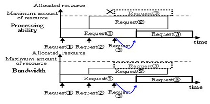 Although Figure 3 shows only one resource type for the sake of simplification, both two types of resource (processing ability and bandwidth) are allocated simultaneously in Methods A and B. As shown in Figure 4, Method A delays resource allocation because of the lack of available processing ability when Request ③ is generated although bandwidth is available. In the same situation, Method B reduces the size of both processing ability and bandwidth at the same ratio and allocates to the request. Not that any request should complete its service within L in Methods A and B.