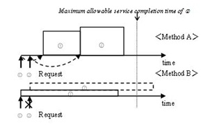 As shown in Figure 9, Method B allocates resources immediately at the arrival of a request. Even if the size of resource allocated is small, the service completion time would exceed L,