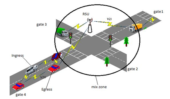 Figure 2 shows the structure of the mix zone, where we see the gates which denote the entry/exit point of the mix zone. The term Ingress refers to vehicles entering mix zone from a particular gate, while the term Egress refers to one leaving the zone.
