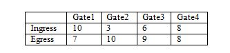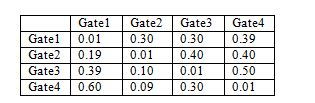 The entries of this matrix represents the probability of linking two lanes of different gates, for example EG_ING_prob_matrix[2][3]=0.4 means that a vehicle entering at gate 2 will leave at gate 3 with probability 0.4.