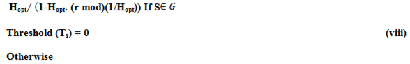 Where Hopt is the desired percentage of cluster heads (chs) for ex:Hopt = 0.05, r is a current round and G is the sequence of nodes which are not picked as cluster heads in the previous 1/p rounds. Each node in the current set G selects a random number from 0 to 1.When this number is lesser than threshold Ts it becomes a cluster head. Due to the introduction of Ts the main role of cluster head is rotated between every two rounds. Mean while an optimal number of cluster heads achieved in every round of leach is calculated by the following formula.