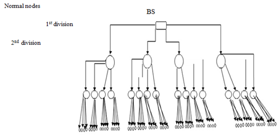 The quad tree is a concept which belongs to an analysis and design of algorithms in computer science which splits a rectangular section of wsns into four different quadrants. Ternary tree divides a tree into three siblings such as left sibling, middle sibling and right sibling etc. In a similar manner a quad tree divides a non-linear data structure tree into four siblings namely one left, two middle siblings and one right sibling etc. The fig 2 shows a wsn which consists of different type of sensor nodes with a divide and conquer based quad tree concept. The below fig 3 represents how to divide a wsn into a four quadrants such as q1, q2, q3 and q4. We have deployed a bs (sink) at the centre of all the four quadrants. The bs is one which controls all the ch which belong to each quadrant like q1, q2, q3 and q4. Each quadrant consists of different types of wireless nodes connected to a cluster head (ch).