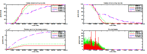 Fig.5,6,7,8. Comparison of DEEC,DDEEC,EDEEC and TDEEC energy efficient routing protocols for alive nodes, dead nodes, packets sent to the bs, chs..