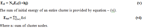 Where E0:-initial energy of a normal node,(1-j) Ncl:sum of quantity of normal nodes, Ncl j:Number of advanced nodes and their energy is:E0(1+h) and the sum of nodes present in each cluster:Ncls. The updating energy of each cluster is calculated by the following equation (v).