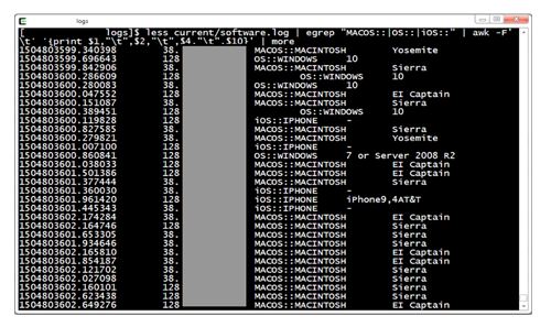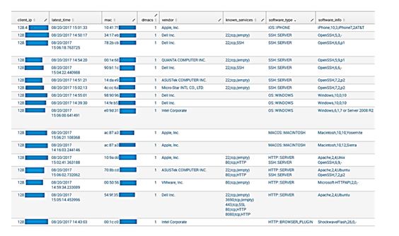 When the above-mentioned component information is recorded in the log files, together with the machine manufacturer information and DHCP logs, a more complete picture can be realized corresponding the endpoints connecting to the network. Any log aggregation tool can be used to glue all the information together, with IP address being the primary key in each type of log file to get an inventory of unconstrained endpoints on the network. Figure 6 shows a screenshot of what an inventory of systems would look like.