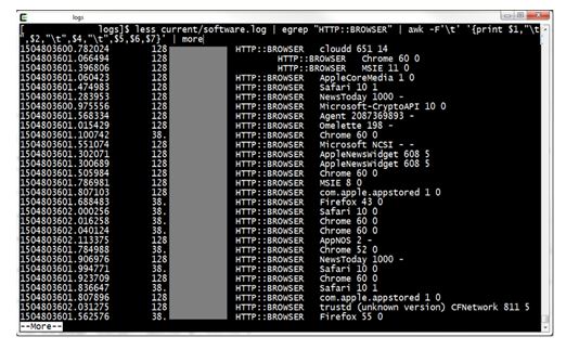 As mentioned before, the inventory can be used to determine which applications and their versions are detected on the enterprise network. This information can be used by the Security and Compliance team of the enterprise to enforce any particular policy and to make sure that there is no unsupported software or application is running on the network. For example, from the inventory, a list of the systems running old OpenSSH[24] can be easily determined by searching for ‘SSH::SERVER‘ keyword, and a notice can be sent to the owner of those devices to update the software and comply with the policies with the enterprise. Another example could be searching for OpenSSL[25] versions from the software.log file and can get a list of the endpoints running old versions of OpenSSL library. Also, if the enterprise has any particular policy for users to be running specific Operating Systems then policy enforcement can also be used to ensure that the systems are running recommended operating system by the enterprise.