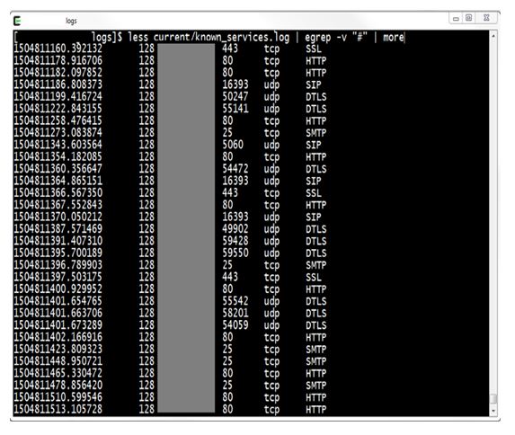 When the Operating System detection scripts are loaded, they start generating the logs in the software.log file corresponding to the network traffic patterns seen by the device. This information is useful, as most exploits are targeted towards very specific OS type and do not unlock themselves when the underlying OS detected is not same as the target OS for the vulnerability exploitation. Figure 1 is a screenshot showing some of the OS detected by the script. Note the extraction command line at the top of this and other figures (1-5). Note also the left column in these figures is the time of the observation in Linux epoch time [23].